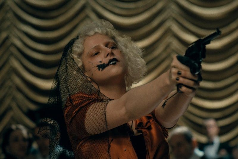 The movie is set in the 1930s, and the Bonnie and Clyde meets Dr. Jekyll and Mr. Hyde vibes are strong. The noir backdrop is accentuated by swooning orchestral strings that rise and fall with the action on screen. Highly stylized monologues and dance numbers blur the line between what’s actually happening and the warped reality of Frankenstein and the Bride.